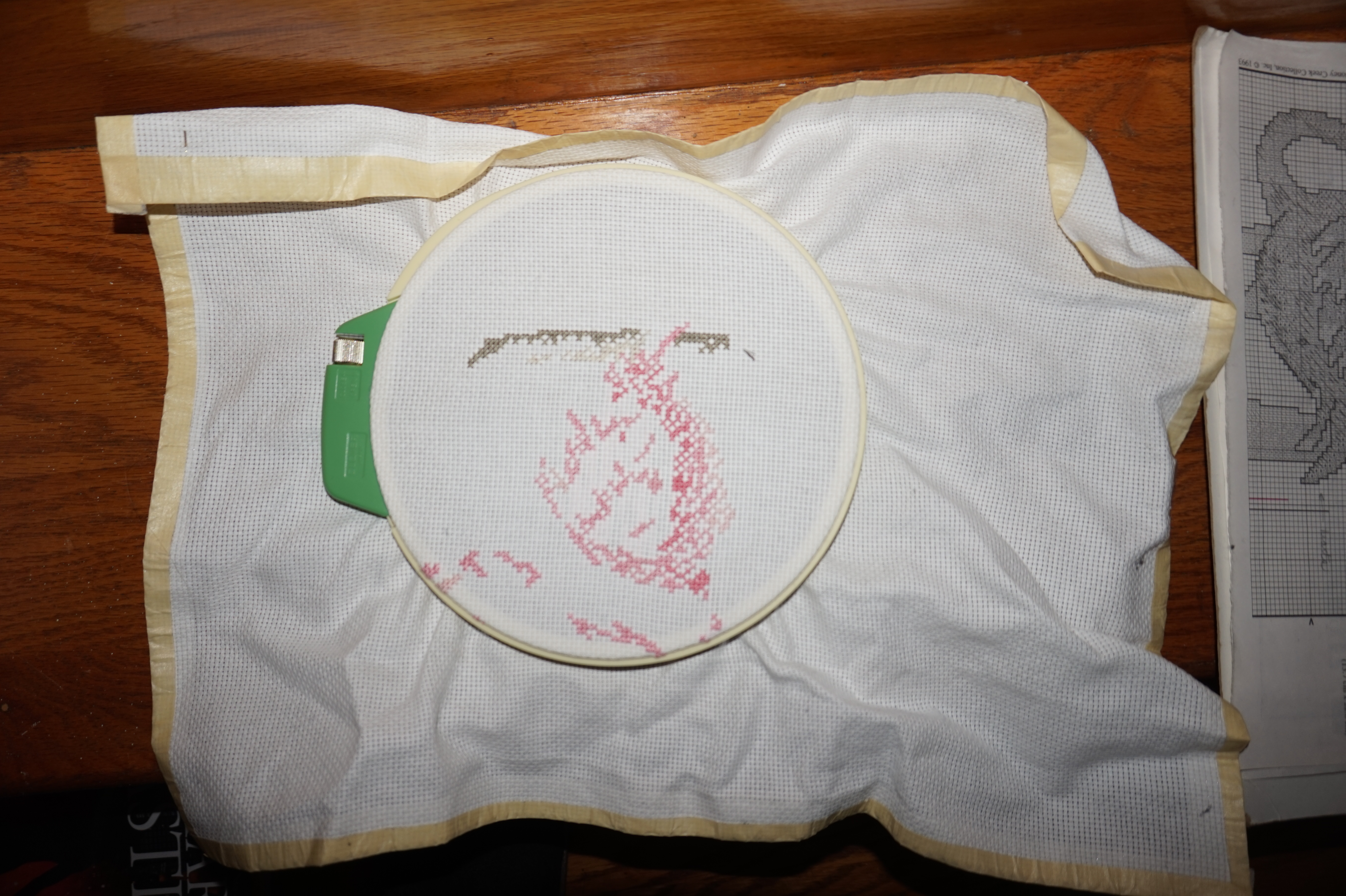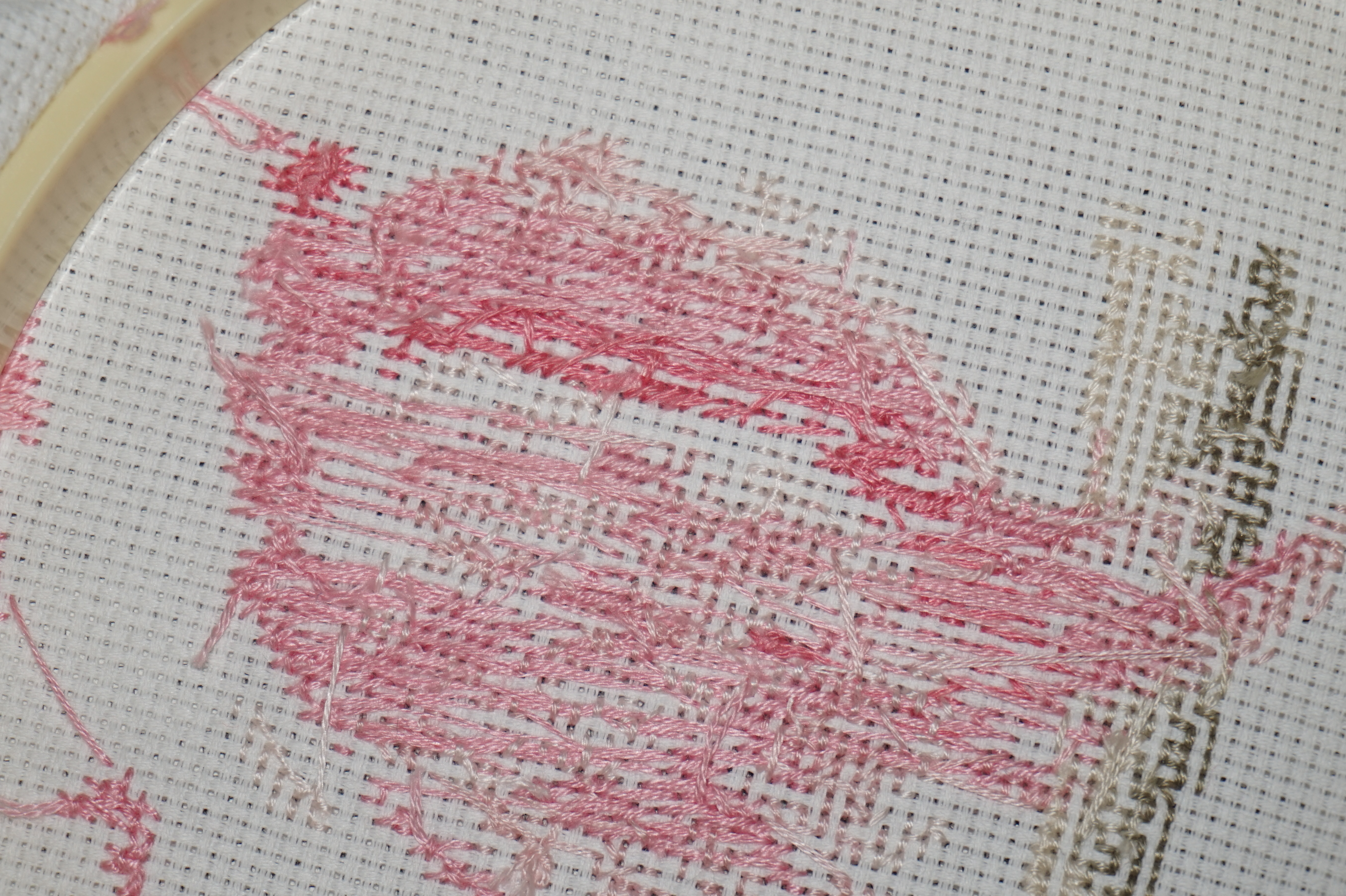 And don’t get me started on the back of the work. I like stitches to be neat and it almost looks like the work was done in rows. Disaster – a complete disaster. It’s a bit hard to see here (ed. excuse potato), but I did the not-pink section. You can see the difference. I’m such a cross stitch snob.