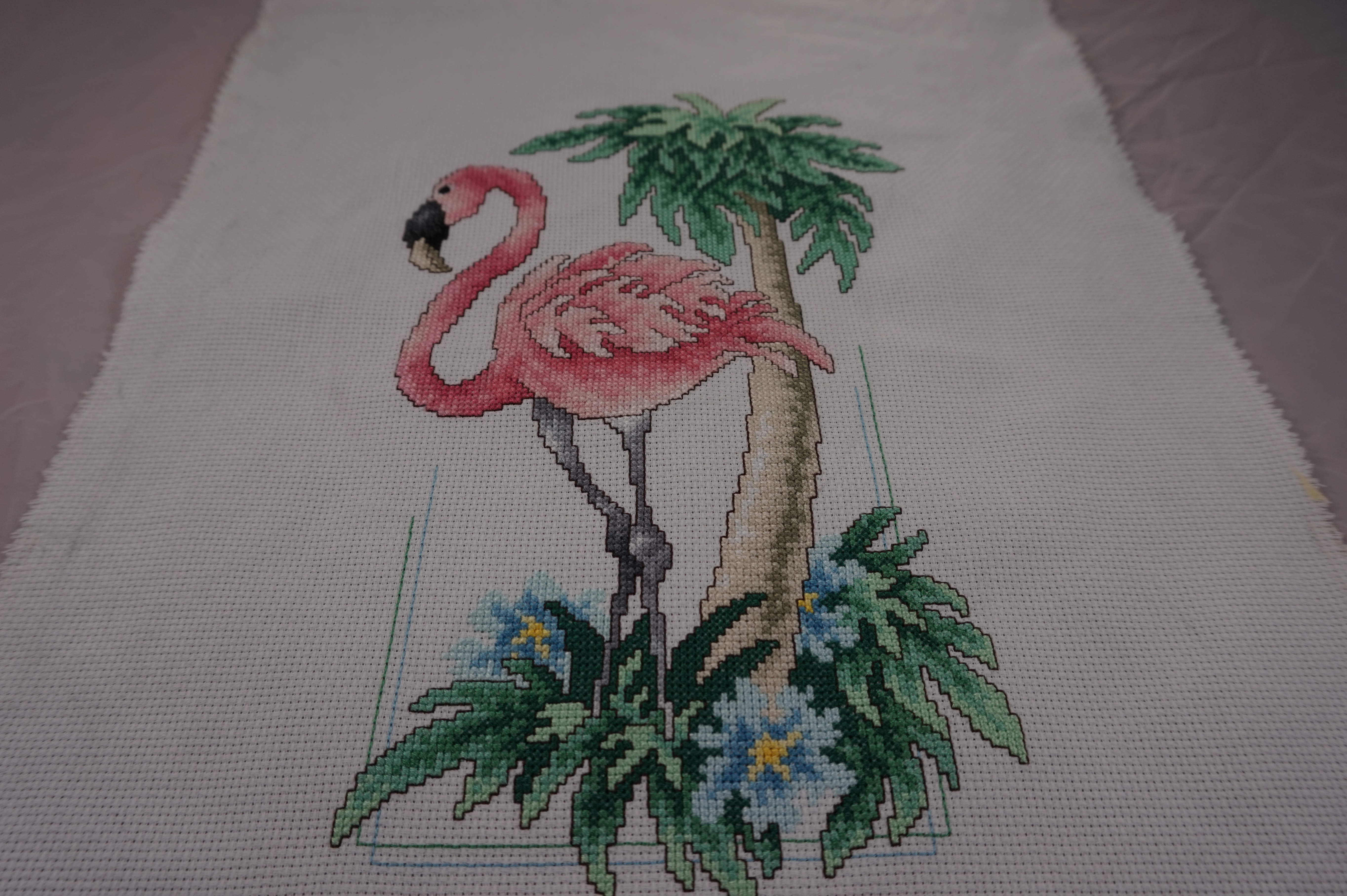 So I finished the flamingo in time for the Mom’s birthday! I still think it’s super ugly, but I can appreciate the design and the colors now that it’s finished. Here is a pic from before I washed and ironed it.